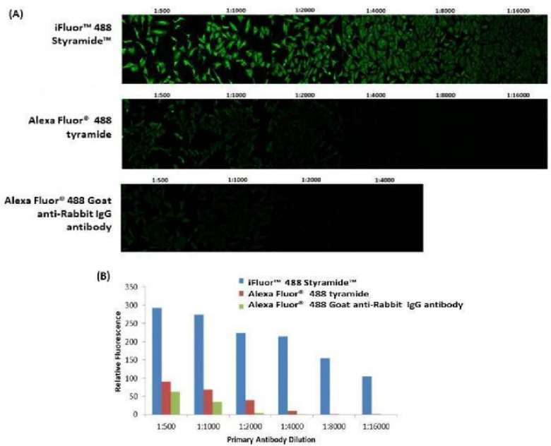 圖4.Styramide 超級信號放大試劑盒的信號強(qiáng)度對比。 (A)將HeLa細(xì)胞固定,透化并用各種濃度的兔抗微管蛋白一抗標(biāo)記,建議的稀釋濃度為:1:500。 然后將細(xì)胞直接與AlexaFluor488綴合的山羊抗兔IgG二抗染色,后分別與HRP標(biāo)記的山羊抗兔IgG二抗、AlexaFluor 488酪胺和iFluor 488 Styramide(#45205)染色。 使用FITC濾光片組拍攝熒光圖像,并以相同的曝光時(shí)間進(jìn)行分析。 (B)測量相對熒光信號強(qiáng)度,并比較不同檢測方法之間的強(qiáng)度。