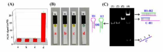 作者在不同的條件下,研究了該方案的可行性。如圖2A所示,沒有目標Kan,C鏈在DNA1-DNA2雙鏈中被阻斷,H1和H2的組裝無法發(fā)生(直方圖a)。如果傳感系統(tǒng)中不存在H1(直方圖b),與直方圖a相比,血糖讀數(shù)沒有明顯變化。在缺少Cas12a的情況下(直方圖c), Cas12a介導的裂解功能無法發(fā)揮作用,血糖儀信號可以忽略不計。正如預期的那樣,只有當檢測系統(tǒng)中所有組分都完整時,才能產(chǎn)生血糖儀讀數(shù)(直方圖d)。