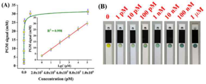 在最佳實驗條件下,研究了Kan濃度與血糖儀讀數(shù)的關系。如圖4A所示,隨著Kan濃度的增加,血糖儀讀數(shù)逐漸增加。同時記錄血糖儀試紙條圓形控制窗口的顏色變化情況,隨著Kan濃度的增加,條帶的顏色逐漸由黃色變?yōu)榫G色(圖4B)。與空白樣品相比,1 pM Kan可以產(chǎn)生明顯的顏色變化,這可以定義為傳感系統(tǒng)的檢測限。如此高的靈敏度可歸因于發(fā)夾DNA的循環(huán)組裝過程,Cas12a的切割能力以及轉(zhuǎn)化酶的多重轉(zhuǎn)化效率。