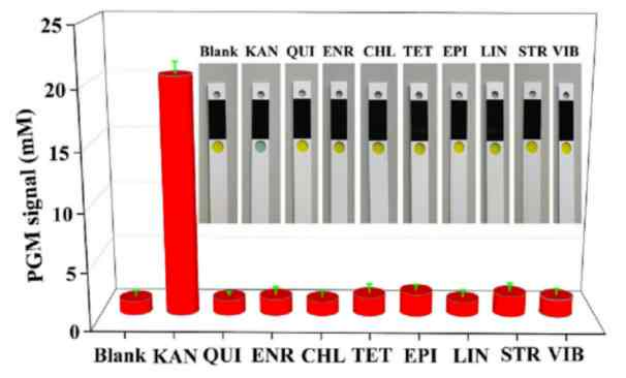 卡那霉素(Kan)是一種含有順二醇的氨基糖苷類抗生素,通常用于畜牧業(yè)和水產(chǎn)養(yǎng)殖業(yè)預防細菌感染??敲顾卮蠖嘤蓜游锏哪I臟代謝為糖苷并通過尿液排出,但Kan的濫用導致動物源性食品和水樣中存在抗生素殘留,最終可能在人體內(nèi)產(chǎn)生累積,可能會導致多種嚴重的副作用(如腎毒性、神經(jīng)毒性、耳毒性和過敏反應),甚至產(chǎn)生抗生素耐藥性。近年來,各種分析技術已被應用于抗生素殘留的靈敏檢測,包括電泳、酶聯(lián)免疫吸附法、熒光法和高效液相色譜法,但是大多數(shù)技術仍存在操作繁瑣、成本高、操作時間長等局限性。因此,需要一種簡單、快速、超靈敏的抗生素檢測策略。今年3月,廣東省科學院生態(tài)環(huán)境與土壤研究所陳俊華等研究人員開發(fā)了一種基于血糖儀和CRISPR-Cas12a的卡那霉素(Kan)檢測方案,該方案具有操作簡單、成本低、便于大眾使用等優(yōu)點,可以實現(xiàn)現(xiàn)場檢測,堅固耐用,可以在資源有限的環(huán)境下實現(xiàn)抗生素殘留的現(xiàn)場檢測。其線性范圍為1 pM ~ 100 nM,檢出限為1 pM。