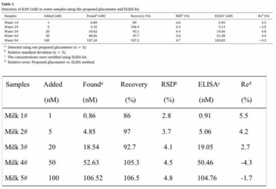 表1. 使用傳感器和ELISA試劑盒檢測水樣和牛奶中的Kan