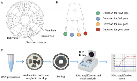 具有高通量和自動化操作能力的微流控技術(shù),能夠整合樣品處理、核酸擴增和檢測過程至單一芯片中。其中,離心式微流控芯片利用離心力通過微通道將樣品及反應(yīng)體系均勻分布于檢測微孔內(nèi),最大程度的降低交叉污染的風(fēng)險,在食源性細菌及ARGs現(xiàn)場檢測方面展現(xiàn)出巨大潛力。近日,中國計量大學(xué)蔣晗副教授和呂晨澤副教授研究團隊開發(fā)了一種快速、準確的免疫磁分離(IMS)-RPA-微流控檢測技術(shù),集成樣品濃縮、核酸提取及等溫擴增步驟,實現(xiàn)副溶血性弧菌及相關(guān)ARGs的實時監(jiān)測,相關(guān)研究成果以“Simultaneous detection of Vibrio parahemolyticus and antimicrobial resistance genes using immonomagnetic separation combined with RPA-microfluidic method in seafood”為題發(fā)表于高水平期刊Food Control。該研究利用優(yōu)化后的IMS技術(shù)完成樣品的預(yù)處理和靶向富集,采用創(chuàng)新設(shè)計的離心微流控芯片檢測副溶血性弧菌及其floR、sul1和qnrA基因。與傳統(tǒng)檢測方法相比,該技術(shù)對實驗條件和操作人員的要求明顯降低,為現(xiàn)場快速監(jiān)測食源性微生物及其ARGs的挑戰(zhàn)提供可行的解決方案。