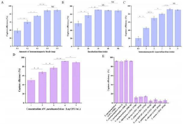 免疫磁珠(IMB)的數(shù)量顯著影響IMS方法的靈敏度,為獲得最佳的捕獲效率(CE),研究人員實驗了多種濃度的IMB,根據(jù)結(jié)果確定0.4 mg為副溶血性弧菌最佳使用量。同時測試獲得最佳孵育時間和孵育溫度。當(dāng)副溶血性弧菌在10? CFU/mL時,CE約為91.87% ± 1.8%,非目標細菌的CE保持在15%以下,因此優(yōu)化后的IMS技術(shù)對副溶血性弧菌具有明顯的特異性。