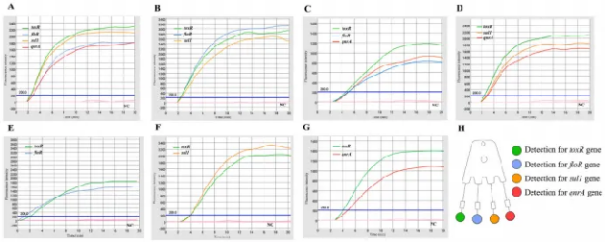 圖4 (A-G)RPA-微流控法同時檢測海產(chǎn)品樣品中副溶血性弧菌及其耐藥基因floR、sul1和qnrA;(H)芯片上各功能單元的詳細視圖。