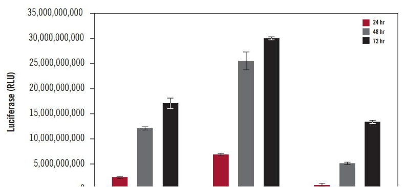 圖4. 使用TransIT®-Insect高效表達蛋白。昆蟲細胞系(A) Sf9,(B) High Five™和(C)果蠅S2在96孔板中轉(zhuǎn)染 0.1 ug的熒光素酶表達質(zhì)粒,轉(zhuǎn)染試劑與質(zhì)粒的比例為2:1。在轉(zhuǎn)染后24、48和72小時三個時間點檢測熒光素酶的表達。Sf9和High Five™細胞在無血清培養(yǎng)基中培養(yǎng)和轉(zhuǎn)染;S2細胞置于含血清的培養(yǎng)基中。