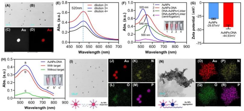 比色探針的表征。金納米粒子的 TEM 圖像(A、B)、映射圖像(C)和 EDS 分析(D)。(B)系列金納米粒子稀釋液的紫外-可見吸收光譜。(F)金納米粒子、金納米粒子-DNA 以及與 DNA 連接子交聯(lián)的金納米粒子-DNA 對的紫外-可見吸收光譜。(G)用 Arm-DNA 修飾前后的金納米粒子的 Zeta 電位。(H)比色檢測可行性評估。使用 DR-CAMCas 測定法與目標(biāo) DNA 反應(yīng)后比色探針的 TEM 圖像(I)和元素分析(J-M)。使用 DR-CAMCas 測定法在沒有目標(biāo) DNA 的情況下比色探針的 TEM 圖像(N)和元素分析(O-R)。