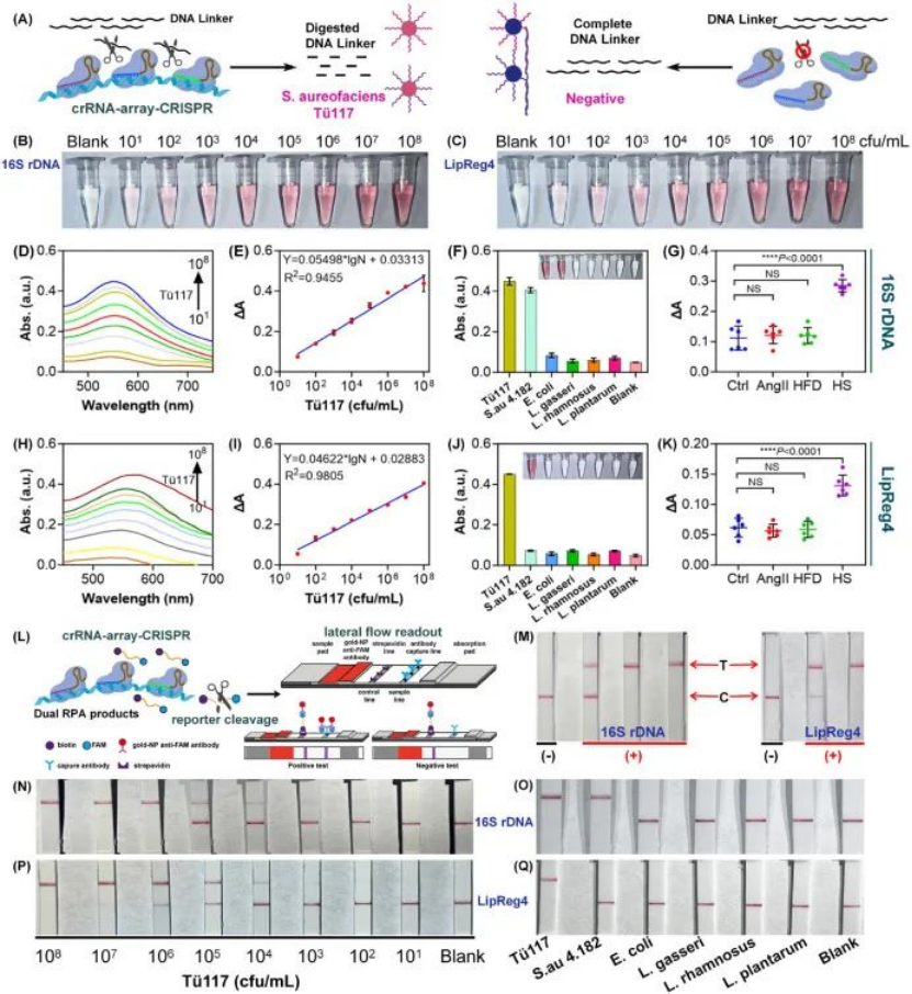 金黃色鏈霉菌 Tü117 的比色法和即時(shí)檢測。(A)金黃色鏈霉菌 Tü117 的肉眼檢測過程。照片(B、C)金黃色鏈霉菌 Tü117 濃度增加時(shí) 16S rDNA 和 LipReg4 基因肉眼檢測的紫外-可見吸收光譜(D、H)及相應(yīng)的線性擬合曲線(E、I)。(F、J)比色 DR-CAMCas 方法對金黃色鏈霉菌 Tü117 檢測的選擇性。(G、K)比色 DR-CAMCas 檢測法在高血壓小鼠糞便樣本檢測中的實(shí)際應(yīng)用。(L)DR-CAMCas 在側(cè)流生物傳感器(LFB)中的整合。基于 DR-CAMCas 的 LFB 檢測法對金黃色鏈霉菌 Tü117 的 16S rDNA 和 LipReg4 基因檢測的可行性(M)、檢測性能(N、P)和選擇性分析(O、Q)
