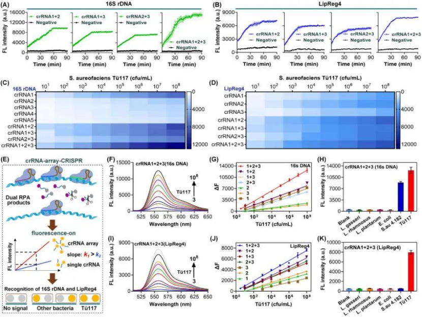 DR-CAMCas 方法對金色鏈霉菌 Tü117 檢測的檢測性能。(A、B)DR-CAMCas 檢測對 16S rDNA 和 LipReg4 基因的熒光響應(yīng)隨時(shí)間變化。(C、D)在不同 crRNA 存在下,由 16S rDNA 和 LipReg4 基因誘導(dǎo)的 DR-CAMCas 終點(diǎn)熒光熱圖。(E)使用 DR-CAMCas 對金色鏈霉菌 Tü117 的識(shí)別過程。DR-CAMCas(crRNA1 + 2 + 3)對金色鏈霉菌 Tü117 的 16S rDNA 和 LipReg4 基因的熒光響應(yīng)(H、K)和選擇性(H、K)。(G、J)使用不同 crRNA 組合的 DR-CAMCas 對 16S rDNA 和 LipReg4 基因的檢測性能。