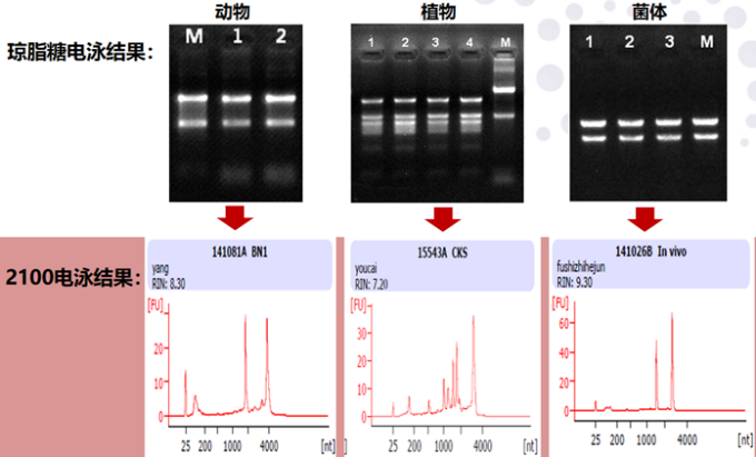 ●注意:mRNA在電泳圖中表現(xiàn)為28S與18S之間的彌散背景,不屬于降解。