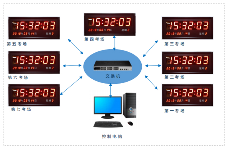 在學(xué)?紙(chǎng)設(shè)計(jì)LED電子鐘,讓考生能時(shí)刻了解考試時(shí)間的進(jìn)度,把握好自己答題的節(jié)奏,考出自己應(yīng)有的水平,同時(shí)學(xué)?紙(chǎng)電子鐘能通過(guò)軟件統(tǒng)一對(duì)所有考場(chǎng)的電子鐘校時(shí),保證所有考生都在同一時(shí)間開(kāi)始和結(jié)束考試,體現(xiàn)學(xué)校教學(xué)的嚴(yán)謹(jǐn)和保證考試的公平公正。